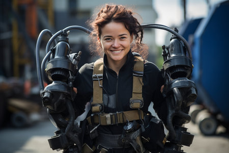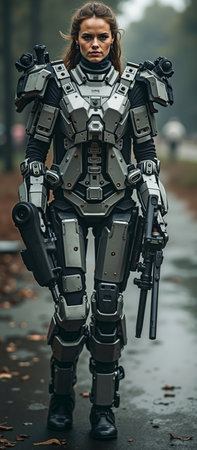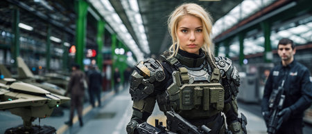 Female soldier in advanced exosuit standing in futuristic drone facility