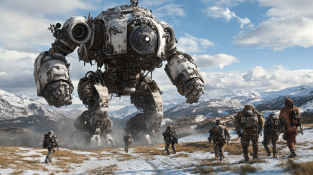 Soldiers are walking in front of a gigantic robot across a snowy, mountainous terrain, perhaps on a mission.