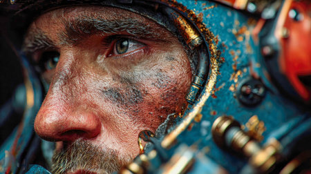 Close-up portrait of a weathered man in protective gear, with deep expression and gritty textures of labor and resilience.