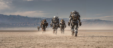 Astronauts in futuristic space suits walk on a dusty, dry desert planet. A breathtaking sci-fi adventure with a sense of exploration and discovery.