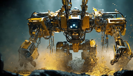 A large yellow robotic machine with multiple arms and legs, standing on a rocky terrain amid dust and debris, showing advanced technology in action.. AI Generation