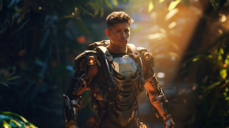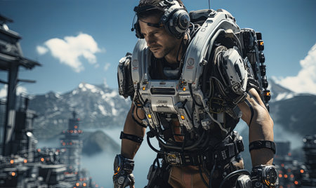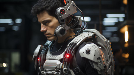 Generative AI A detailed illustration of a person wearing a bionic exoskeleton, emphasizing enhanced mobility, strength, and support