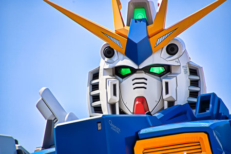 Fukuoka, Japan - Mar 19 ,2023 - Full-size Mobile suit RX-93ffv (Nu) Gundam at the Gundam Park in front of Mitsui Shopping Park Lalaport Fukuoka.