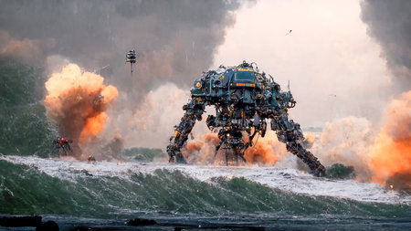 Battle robots emerge from the sea.Territory capture.Naval Assault.Space Invasion.Robots out of control.3d render illustration