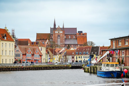 Harbor in the old town of the Hanseatic city of Wismar, view on historic houses and the red-brick Georg church, travel destination and tourist magnet at the Baltic sea in Germany, copy space