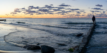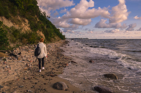 Beautiful morning landscape by the Polish sea. Female tourist walking along the shore of the Baltic Sea in Gdynia, Poland.