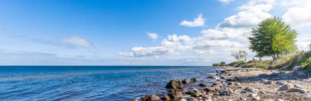Sea stone beach landscape with blue sea, green hills and beautiful white clouds at sunny summer day