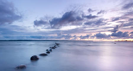 Beautiful Baltic sea landscape with stone breakwater. Tranquil long exposure landscape