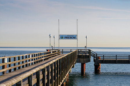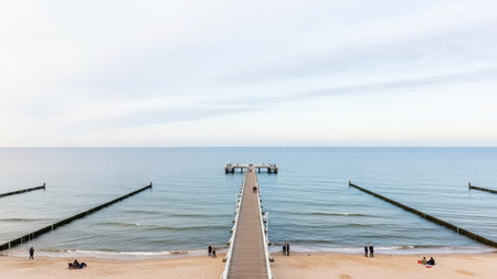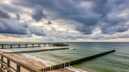 on the coast of the baltic sea on zingst. the pier and the groynes that reach into the water. beautiful light atmosphere in a romantic place