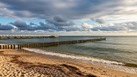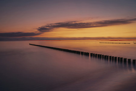 groynes jutting into the baltic sea. clouds shrouded with warm light atmosphere