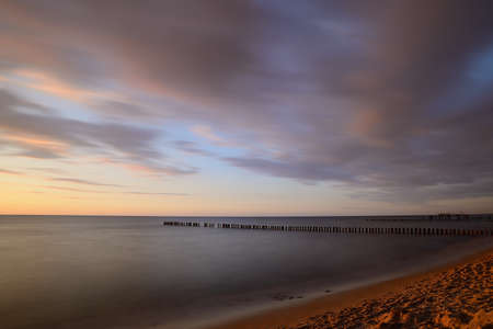 Setting sun seen from the beach in Darłówko, Poland. Beautiful seascape. Wooden breakwater on the horizon. Blur effect (long exposure)
