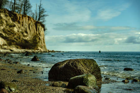 Beautiful Baltic sea shore with big cliff in Gdynia Orlowo. Seashore long exposure photo.