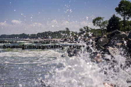 maritime background, wooden breakwater in calm baltic sea against blue sky