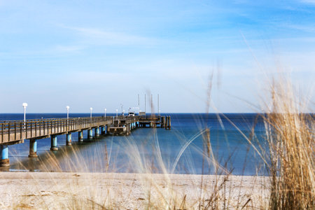 A Baltic Sea pier is visible in the distance with a body of water in the background. The water is calm and the sky is clear. Germany