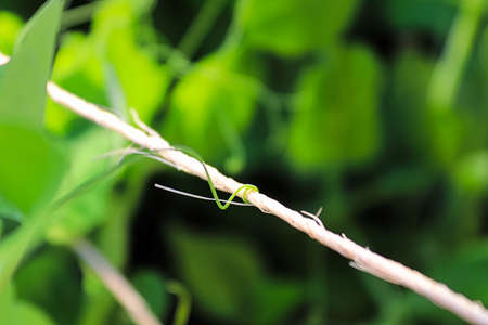 A pea vine curling around a string.