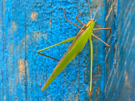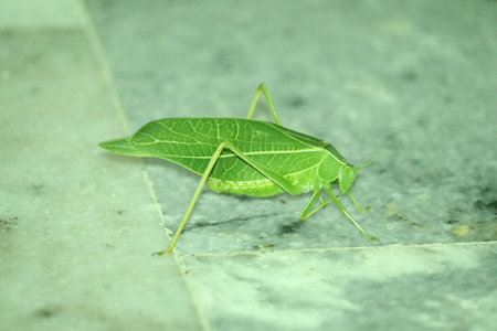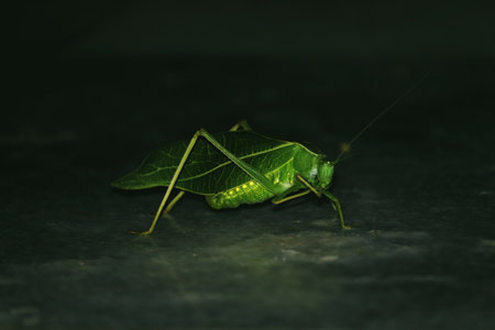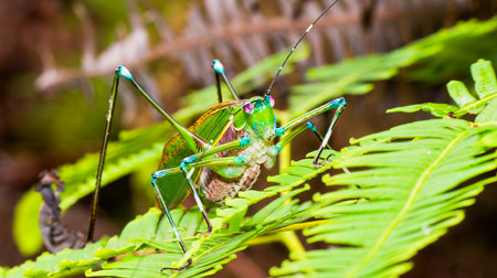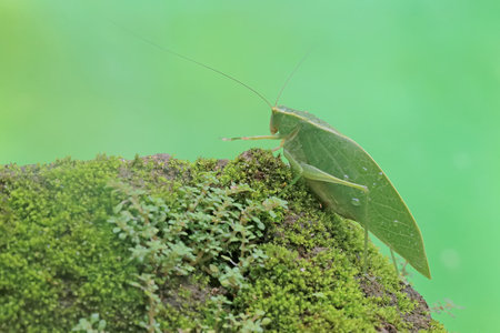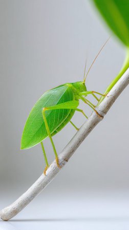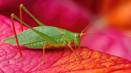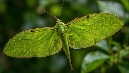 Vibrant katydid with intricate leaf like wings in natural habitat
