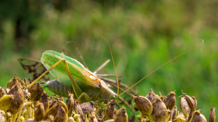 A green bush cricket (Tettigonia viridissima) on a burdock flower