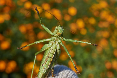 large green grasshopper hides in the garden flowers