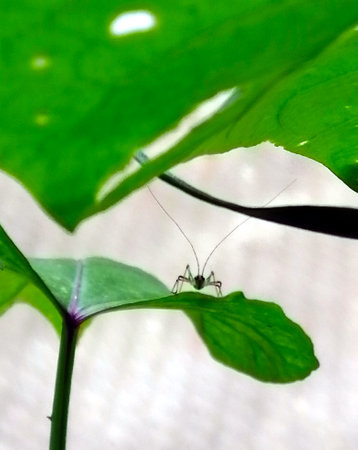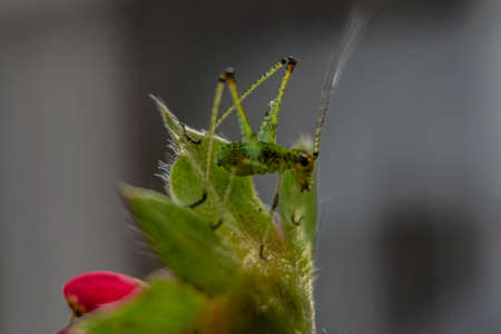 Young tiny grasshopper hiding in the green foliage. closeup macro