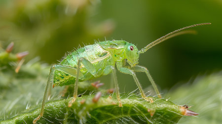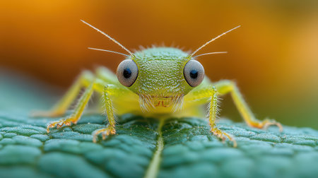 A small green insect with large eyes is perched on a leaf showcasing its intricate features and vibrant color in a natural environment.
