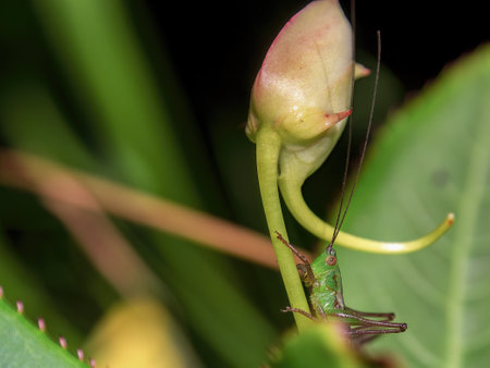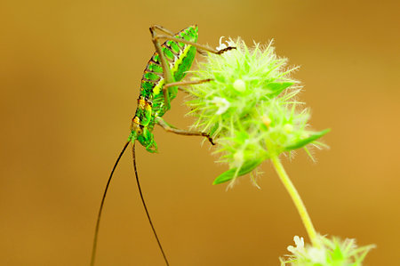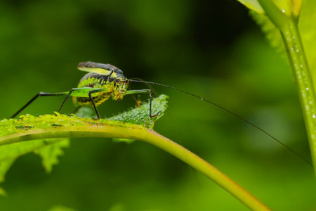 Close-up pf a speckled bush cricket, Leptophyes punctatissima