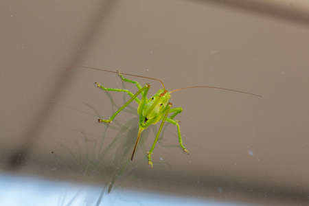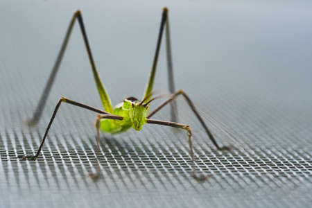 big green grasshopper on window. High quality photo
