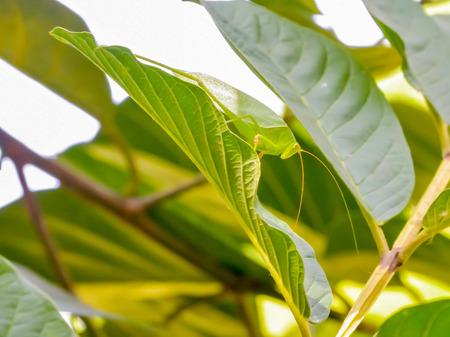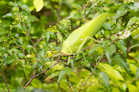 A young green grasshopper is foraging in the bushes. This insect has the scientific name Mecopoda nipponensis.