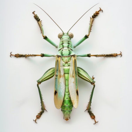 This captivating close-up image showcases a green grasshopper, emphasizing its intricate anatomy and textures. Ideal for educational resources in biology or entomology.