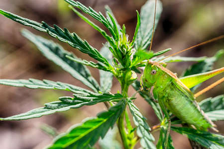 Green grasshopper sitting on young green leaves, grass. View of the insect from behind, close up. Mimicry in nature. Natural botanical background.
