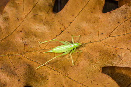 Meconema thalassinum, oak bush-cricket or drumming katydid on a leaf in a tree