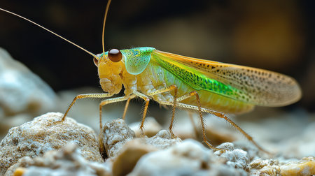A vibrant green grasshopper is perched on a rocky terrain showcasing its delicate features and colors in a natural setting.