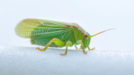 A close-up view of a green grasshopper standing on a white surface. The image highlights its slender body, long antennae, and intricate textures, portraying the beauty of nature.