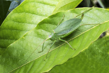 a small green grasshopper or katydid on a leaf