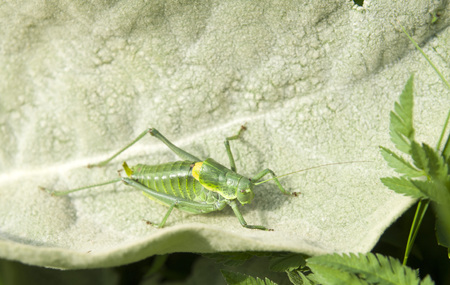 Grasshopper grip on large leaves to camouflage it.