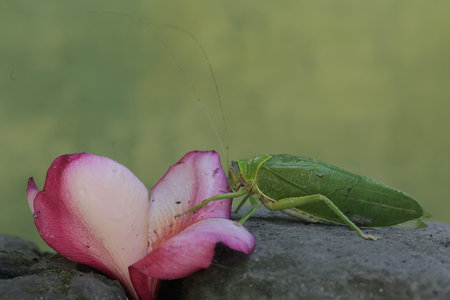 Grasshopper on a pink flower with green background in the garden