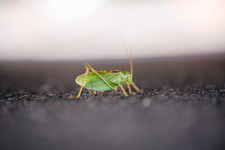 Big, green grasshopper sitting on asphalt road. Sunny summer background