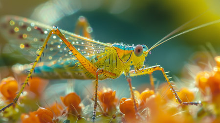 A detailed macro shot featuring a green grasshopper resting on a textured leaf, highlighting the intricate patterns and vibrant colors of both the insect and foliage.