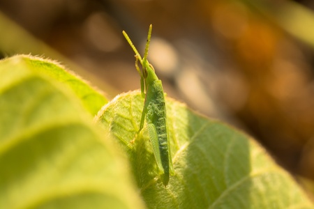 Grasshopper on green leaf background