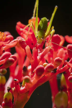 Grasshopper on a pink flower in the rainforest.