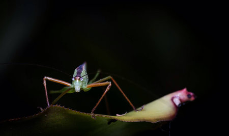 A macro image of a black kneed cone head siting on a leaf