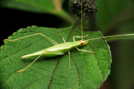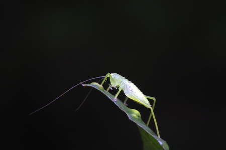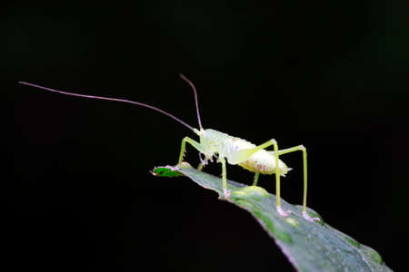 longhorned grasshoppers nymphs on green leaf in the wild