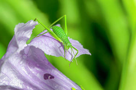 Green grasshopper on a purple flower. Close-up.