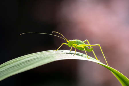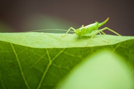 Green grasshopper sitting on leaf. Small Tettigonia viridissima with long antennae sit in grass, side view. Nymph of great green bush-cricket, soft selective focus