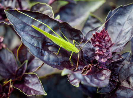A green grasshopper is sitting on a leaf of a purple plant. The leaf is large and has a dark purple color