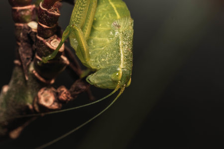 A macro shot of a green grasshopper on a twig against a dark background