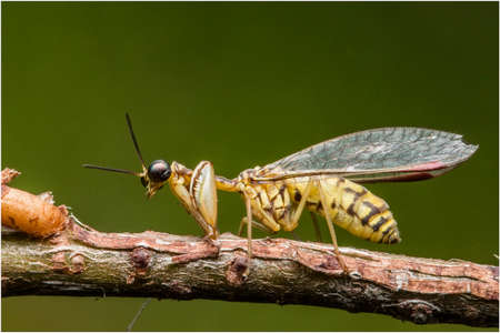 Natural closeup on a female Common scorpionfly, Panorpa vulgaris sitting on a green leaf