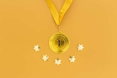Simply flat lay design winner or champion gold trophy medal isolated on yellow colorful background. Victory first place of competition. Winning or success concept. Top view copy space