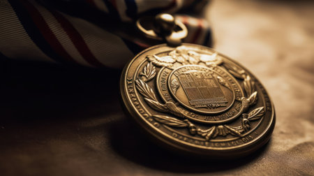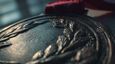 Macro shot capturing the intricate texture of an engraved medal, bathed in soft sunlight. The shallow depth of field highlights the storytelling detail of victory.