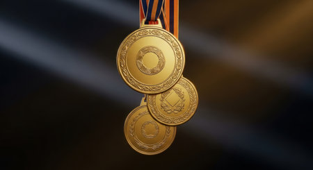 Three gleaming gold medals with intricate designs hang from a striped ribbon against a dark background, symbolizing victory, achievement, and success in competition.