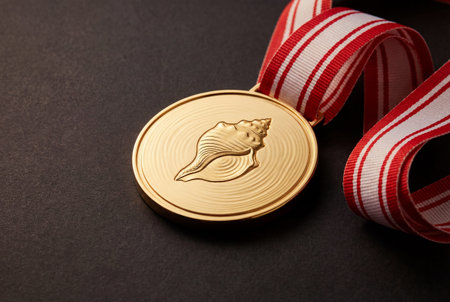 A close up view of a shiny gold medal with an embossed seashell design and concentric rings attached to a red and white striped ribbon resting on a dark black textured surface.
